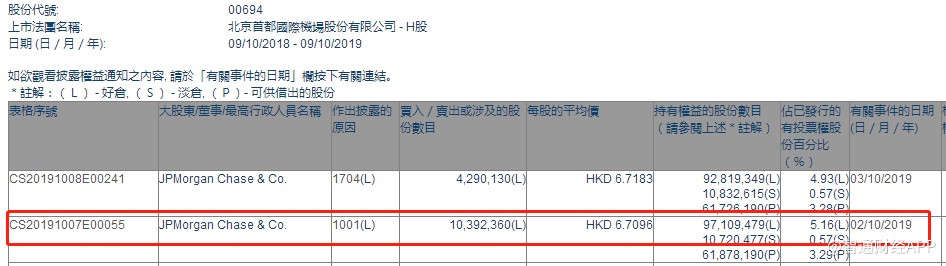 智通财经APP获悉,联交所最新资料显示,10月2日,摩根大通增持北京首都机场(00694)1039.24万股,每股作价6.71港元,总金额约为6973.30万港元。增持后持股数目约为9710.95万股,持股比例为5.16%。