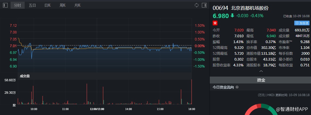 截至今日收盘,北京首都机场跌0.43%,报6.98港元。
