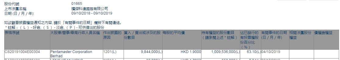智通财经APP获悉,联交所最新资料显示,10月4日,槟杰科达(01665)遭控股股东Pentamaster Corporation减持984.4万股,每股作价1.9港元,总金额约为1870.36万港元。减持后最新持股数目约为10.09亿股,最新持股比例为63.1%。