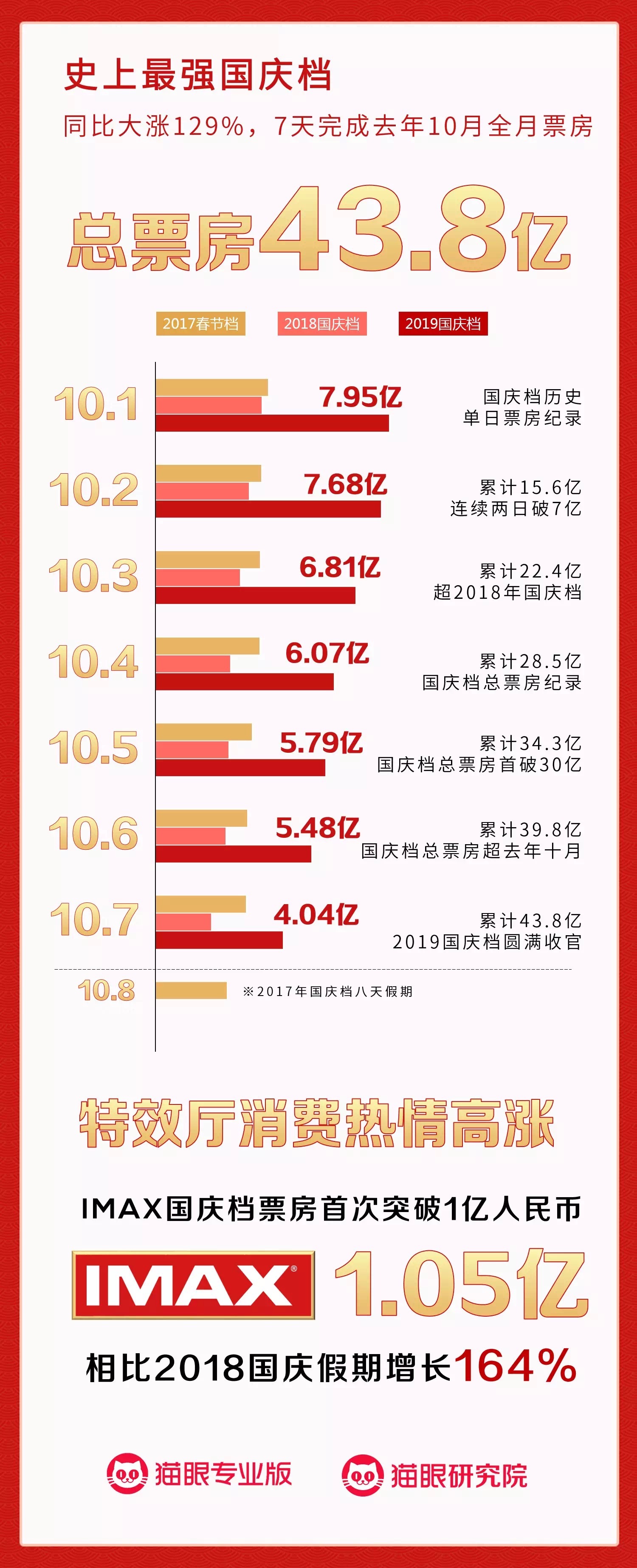 7天,43.8亿。这届国庆档称之为“史上最强”应该没有人会反对。