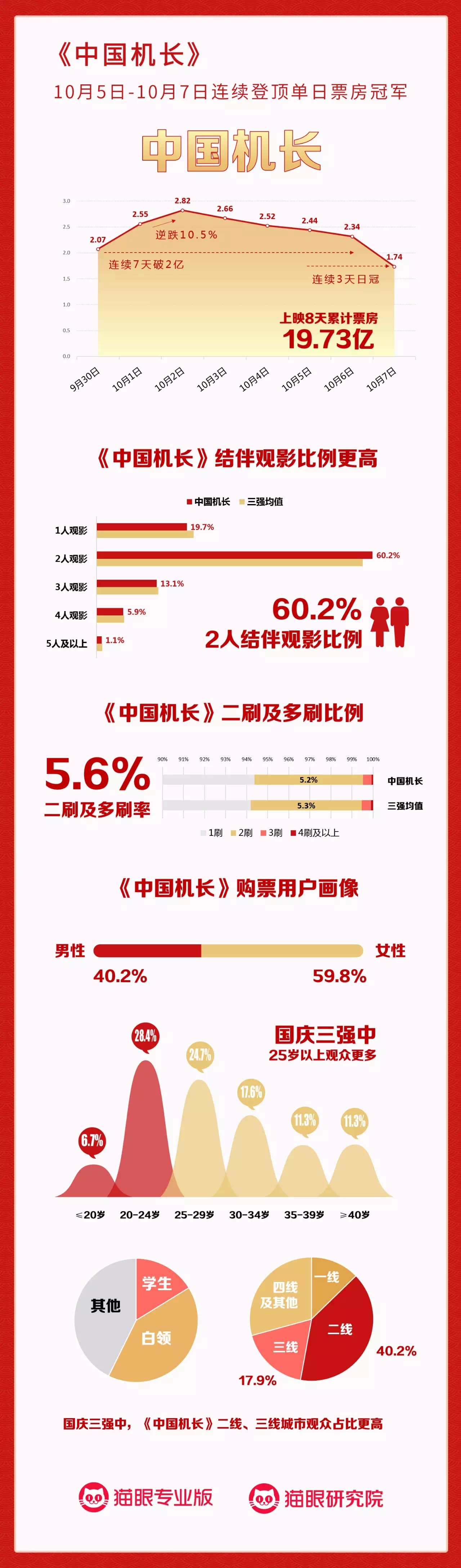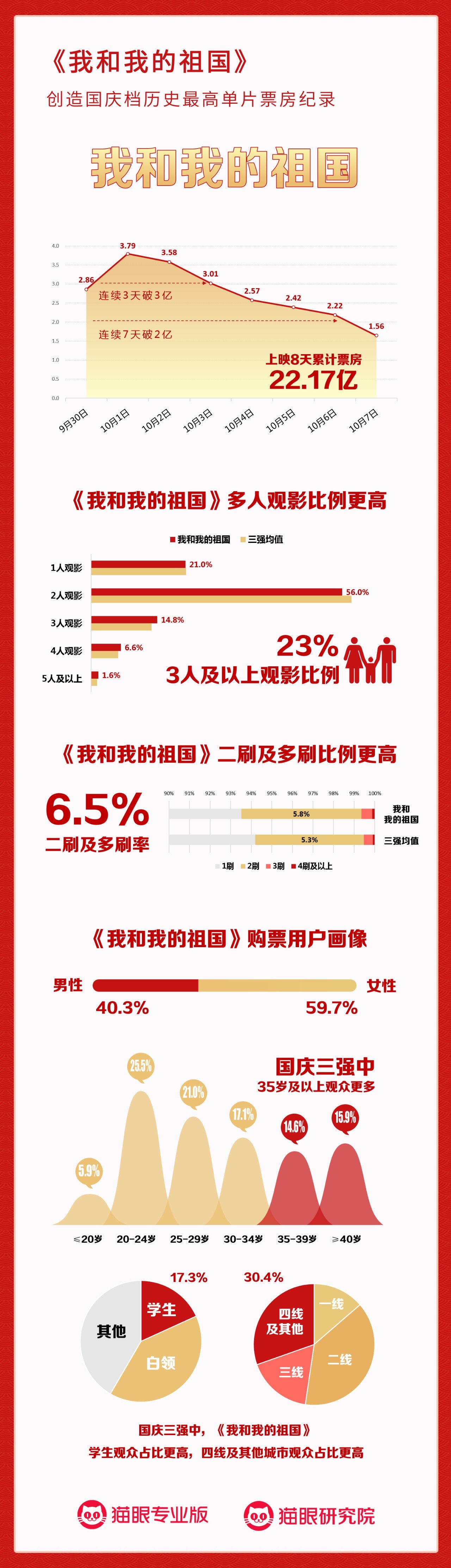 同时收获N个“更高”,在国庆档同期影片中,《我和我的祖国》多人观影比例更高,3人及以上观影比例达到23%;二刷及多刷比例更高,多刷率达6.5%;学生观众占比更高;四线及其他城市观众占比更高。
