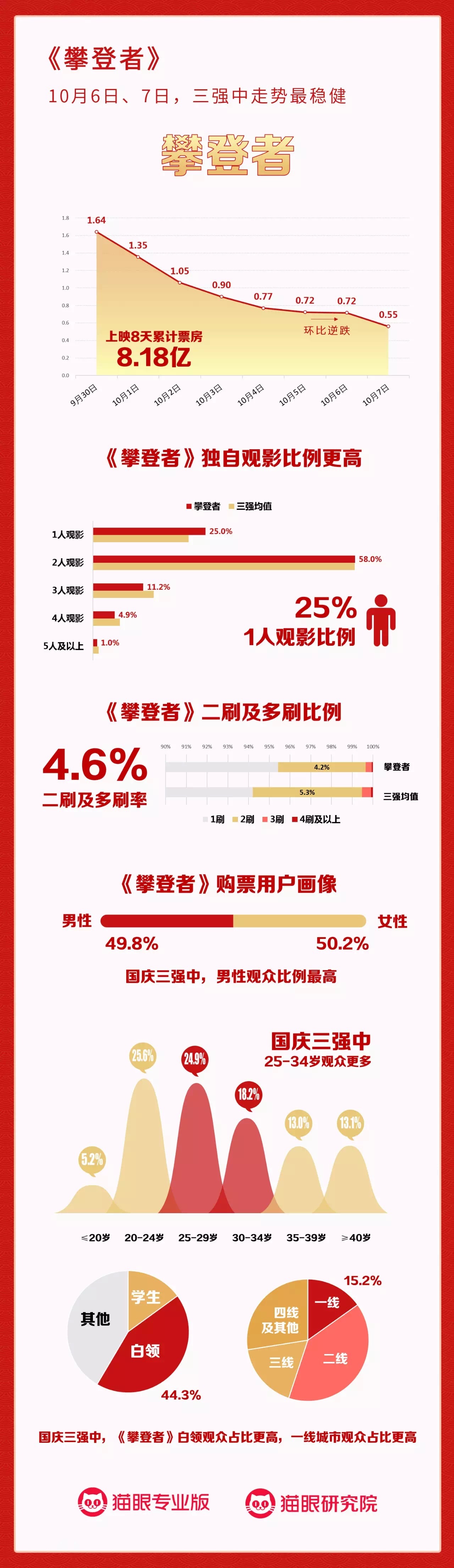 从《攀登者》的用户画像也能看出,这类新类型、新题材的电影在年轻观众、一线城市、白领群体中接受度更高,其中白领占比达到了44.3%。