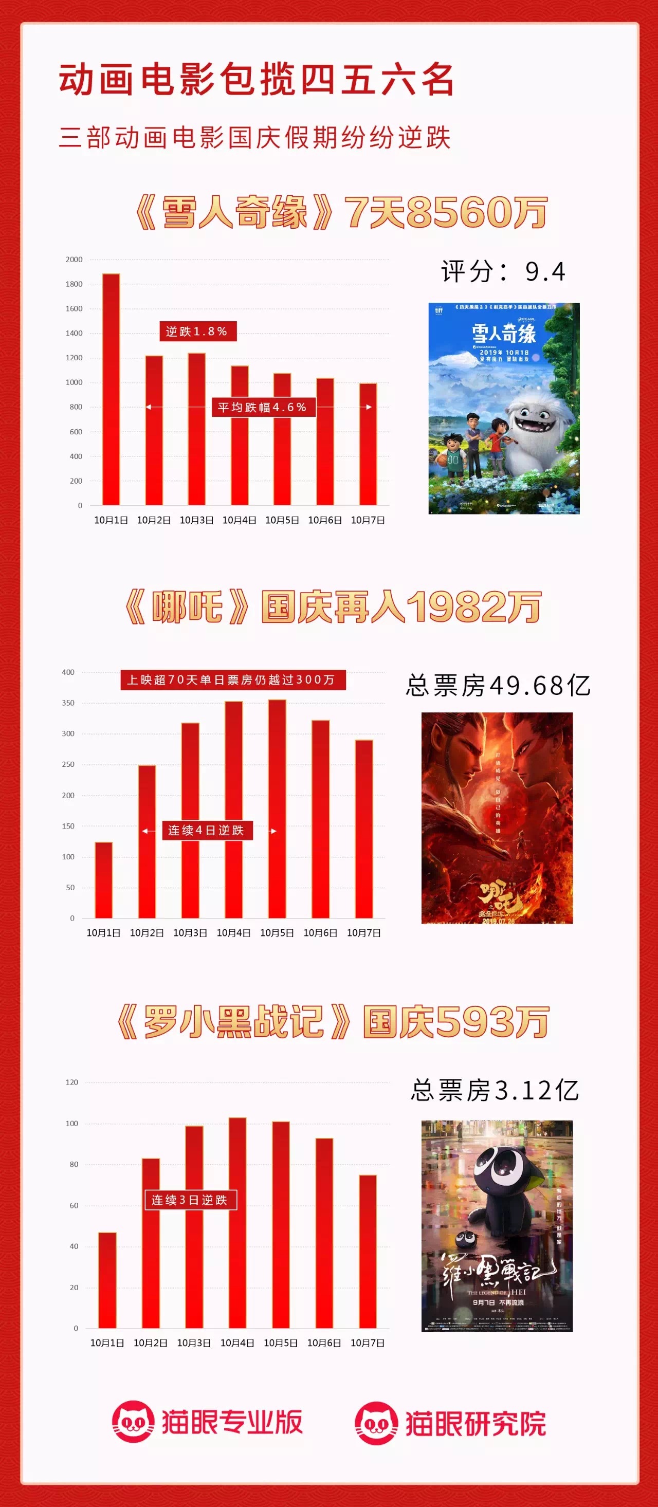 除了“三巨头”之外,每年国庆档必备的动画电影也成了亲子群体的不二选择。新片《雪人奇缘》7天斩获8560万,并且在第3日实现了逆跌。而口碑佳作《哪吒》和《罗小黑战记》也继续发挥“长尾效应”,《哪吒》在上映70天后仍能实现单日票房300万,连续4日逆跌,两部动画佳作最终在档期内收获1982万和593万票房。