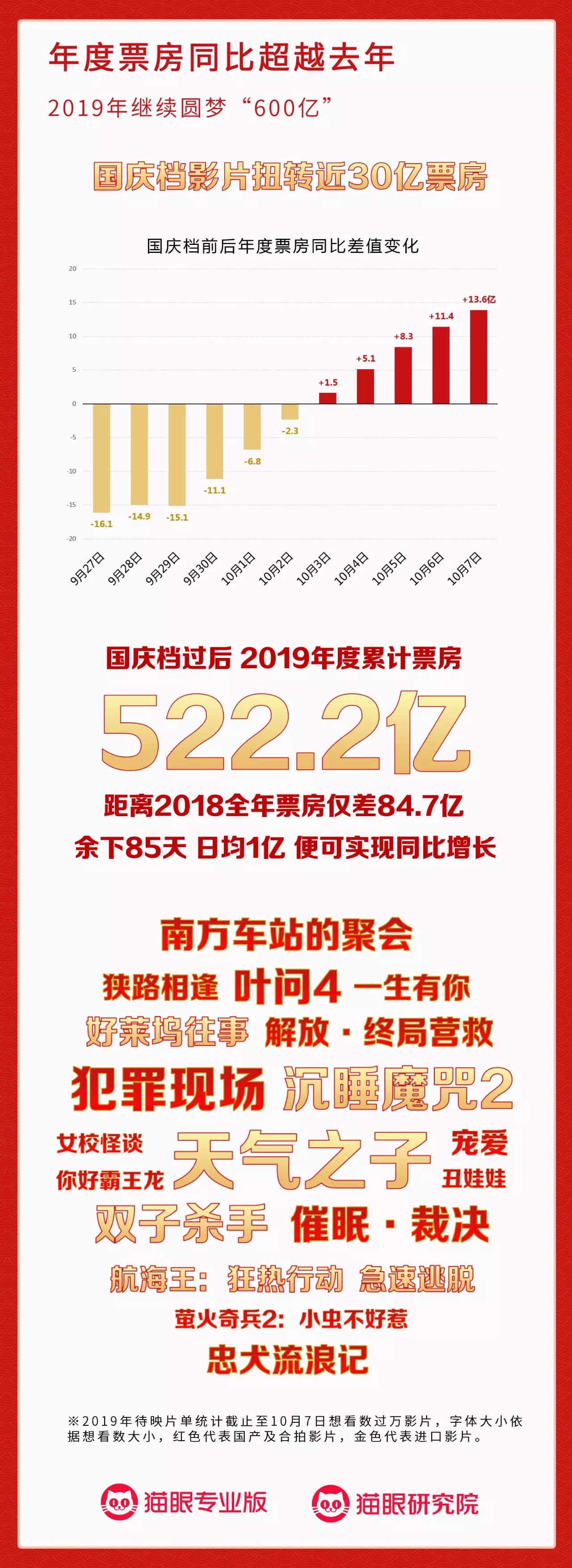 也正是在双核“引擎”驱动下,国庆档过出来“小春节档”的感觉。在有了国庆档的43.8亿的助攻下,今年中国电影票房累计已经高达522.2亿,离2018年全年票房仅差84.7亿,2019年全年票房突破600亿不是梦。