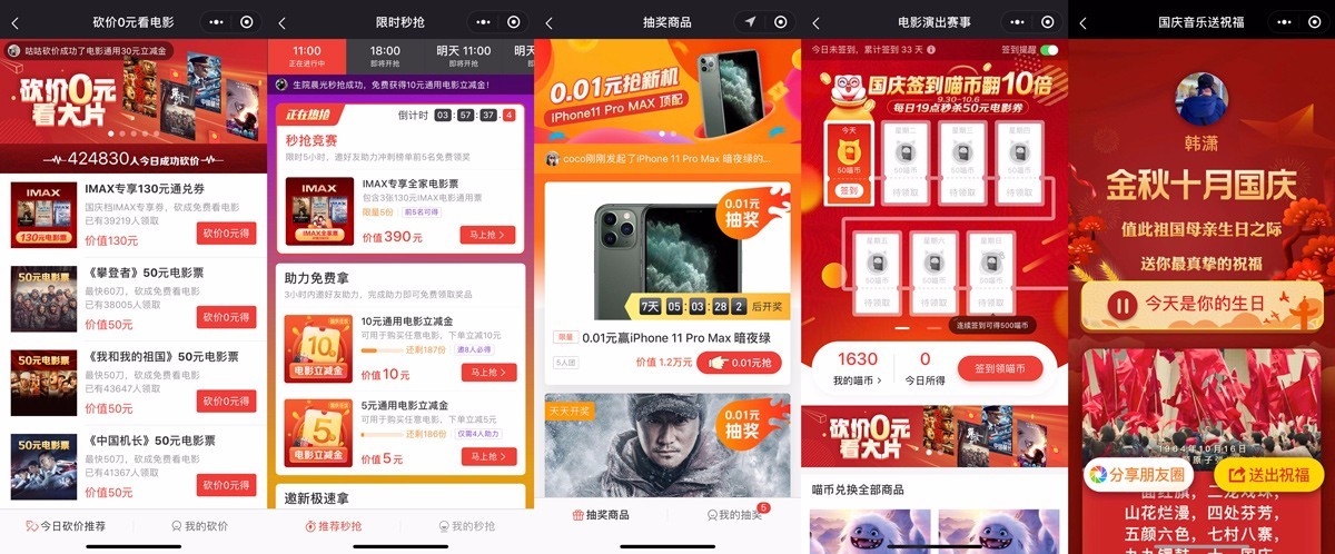 在渠道曝光方面,猫眼在线上有得天独厚的优势,其中猫眼小程序的引流,为国庆档“三巨头”的曝光提供了一个很好的窗口。预售期间,猫眼微信小程序首页更换成了国庆档特别页面,并推出线上5大活动——砍价邀请好友助力0元看电影,秒抢热门影片衍生品,拼团0.01元赢取苹果最新手机,演员吴京发放红包,转发国庆音乐送祝福卡。