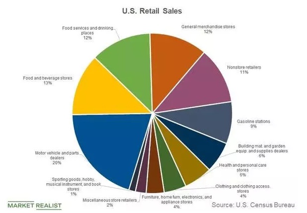 2018年,汽车和零部件经销商的销售额占美国零售总额的20%。这个类别包括汽车经销商和汽车零部件、配件和轮胎零售商。此外,食品和饮料零售商包括杂货店和超市以及酒类零售商,占美国零售总额的12.5%。这类零售商的包括Kroger (KR.US)和Sysco (SYY.US)。