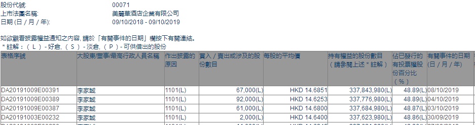 智通财经APP获悉,联交所最新资料显示,主席李家诚于10月3日、4日及8日分别增持美丽华酒店(00071)6.1万、9.2万及6.7万股,每股作价分别为14.68港元、14.6253港元及14.6851港元,总金额约为322.49万港元。增持后持股数目约为3.38亿股,持股比例为48.89%。