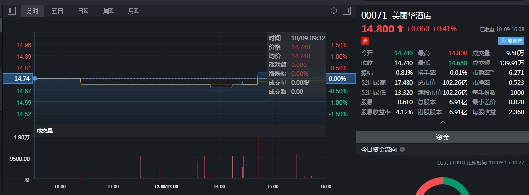 截至今日收盘,美丽华酒店涨0.41%,报14.80港元。