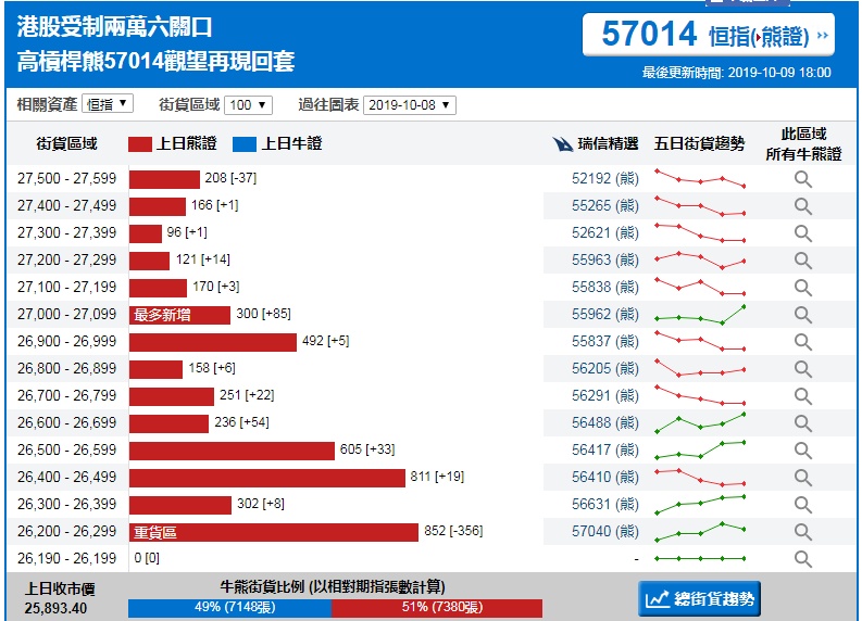 智通财经APP获悉,截至10月10日,恒指最新的牛熊街货比例49:51。瑞信恒指牛熊证街货分布图中的数据显示,熊证街货重货区在26200-26299区间,该区间最新熊证数量为852张,较上一交易日减少356张,最多新增在27000-27099区间,较上一交易日增加85张。牛证街货重货区在25000-25099区间,该区间最新牛证数量为790张,比上一交易日增加10张;最多新增在25700-25728区间,较上一交易日增加135张。
