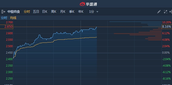 智通财经APP获悉,猪肉概念随A股大幅攀升,中粮肉食(01610)午后涨幅再度扩大,截至13时35分,涨8.16%,报价2.65港元,成交额4142万。