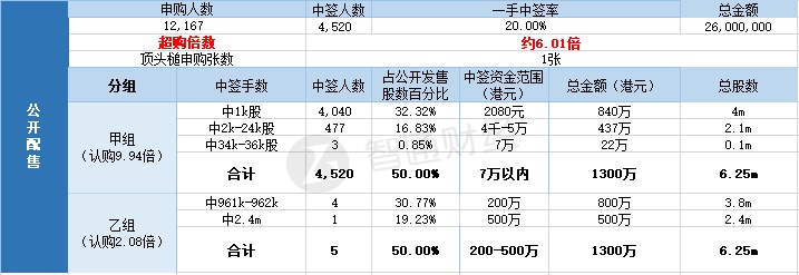 其中,公开配售申购人数12167,一手中签率20%,超购倍数6.01倍。
