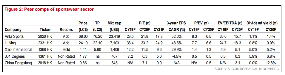 我们维持此前的投资论点,即是国内需求强劲将推动国内运动服装公司实现强劲盈利增长。鉴于安踏所有品牌的盈利强劲增长,该股份是我们目前的首选。在最近对销售渠道进行调研后,我们亦看到公司对新收购品牌的整合进展顺利。