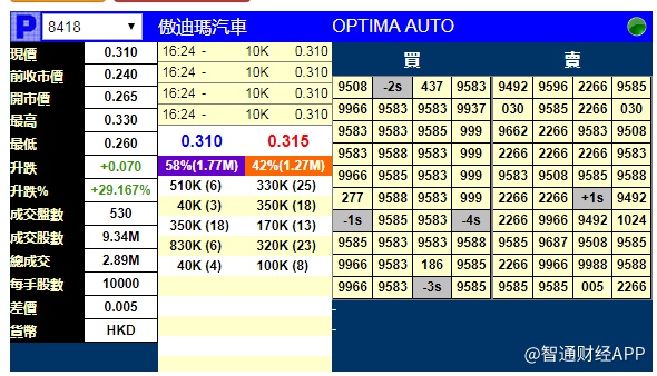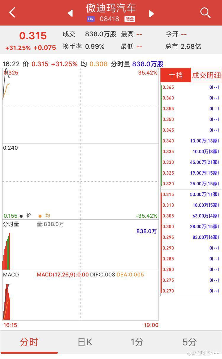 智通财经APP获悉,傲迪玛汽车(08418)将于10月11日挂牌,截止到发稿,辉立证券暗盘交易显示其报价0.31港元,较招股价0.24港元涨29.167%。每手10000股,不计手续费,每手赚700港元。