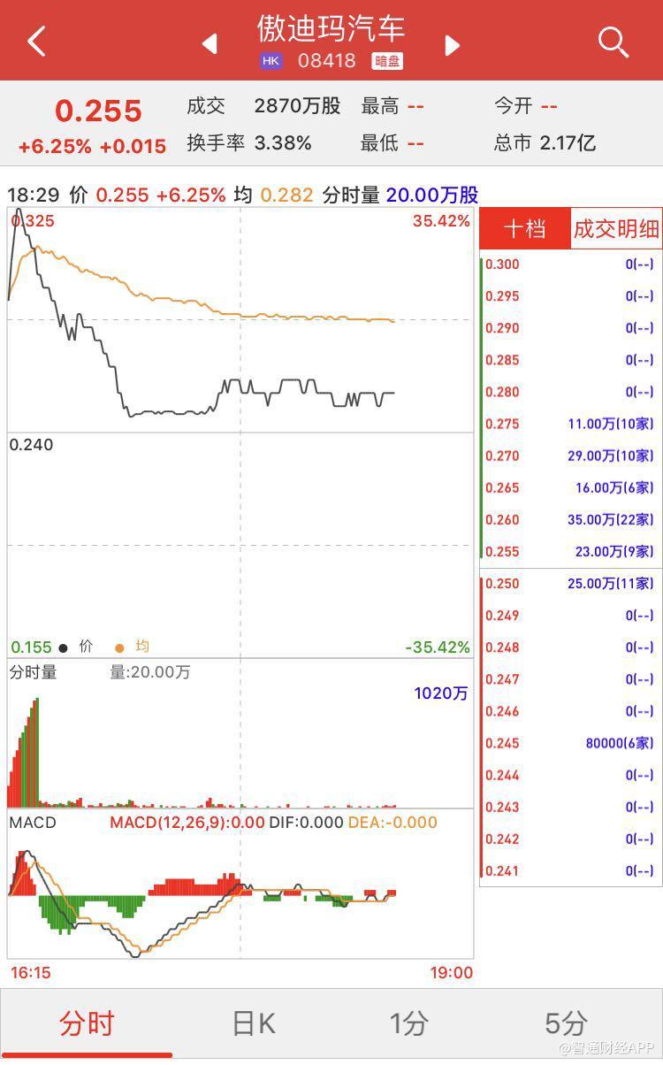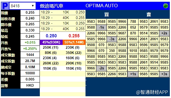 智通财经APP获悉,傲迪玛汽车(08418)将于10月11日挂牌,上市前夕,辉立证券暗盘交易显示其收报0.255港元,较招股价0.24港元涨6.25%。每手10000股,不计手续费,每手赚150港元。