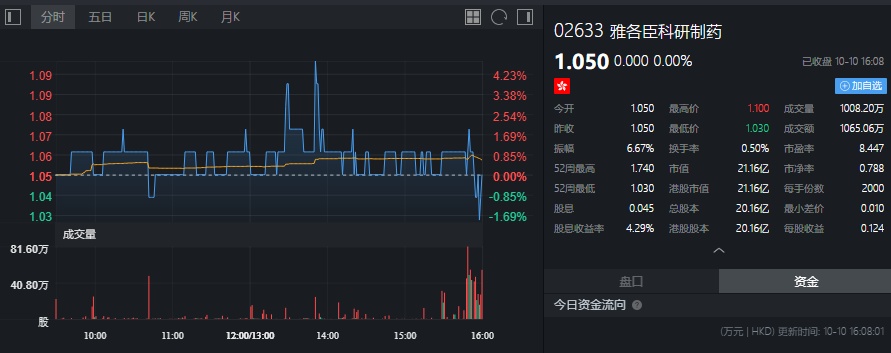 截止至今日收盘,雅各臣制药(02633)无涨跌,报1.050港元。
