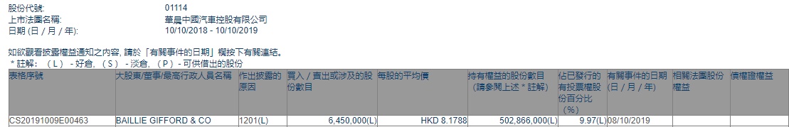 智通财经APP获悉,联交所最新资料显示,10月8日,华晨中国(01114)遭大股东Baillie Gifford减持645万股或0.12%,每股作价8.17港元,总值约5269.65万港元。减持后持股数目约为5.02亿股,最新持股比例为9.97%。
