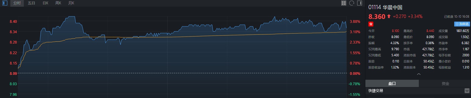 截止至今日(10日)收盘,华晨中国(01114)涨3.34%,报价8.36港元