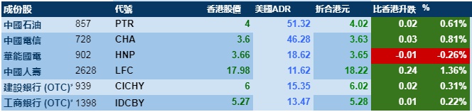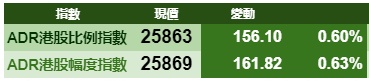 智通财经APP获悉,周四(10月10日)美股收高,道指上涨近150点。港股ADR指数全日向好,按比例计算,收报25863点,涨156.10点或0.60%。大型蓝筹全线走稳,汇丰控股收报57.87元,较港收市涨0.42元;腾讯控股收报320.98元,较港收市涨2.18元。