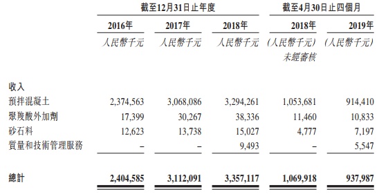 其中销售预拌混凝土占该公司收入的大部分,截至2016年—2018年12月31日止年度以及2019年截至4月40日止四个月,销售预拌混凝土的收入分别为人民币2374.6百万元、人民币3068.1百万元、人民币3294.3百万元和人民币914.4百万元,分别占同期总收入的98.8%、98.6%、98.1%和97.5%。