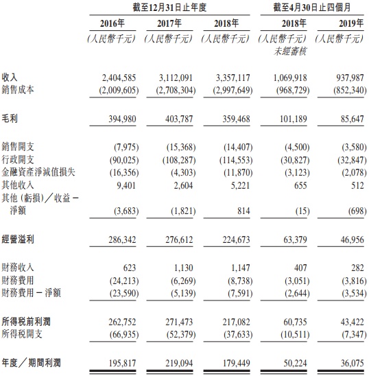 截至2016年—2018年12月31日止年度以及截至2019年4月30日止四个月,公司的期内利润分别是人民币195.8百万元、人民币219.1百万元、179.4百万元及人民币36.1百万元。截至2019年4月30日止四个月,公司的期内利润由截至2018年4月30日止四个月的人民币50.2百万元减少28.2%至人民币36.1百万元,主要由于收入减少所致,这是由于公司客户承接的若干大型基建项目接近完工而新的高速公路项目尚未达到需要大量混凝土供应的阶段,导致预拌混凝土销量减少。