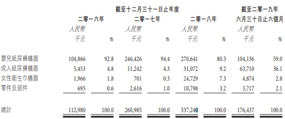于往绩记录期间,公司的产品主要包括婴儿纸尿裤机器、成人纸尿裤机器及女性卫生巾机器。其中销售婴儿纸尿裤机器是公司的主要收入来源,截至2018年12月31日止三个年度各年及截至2019年6月30日止六个月,该收入分别占总收入的92.8%、94.4%、80.3%及59.0%。