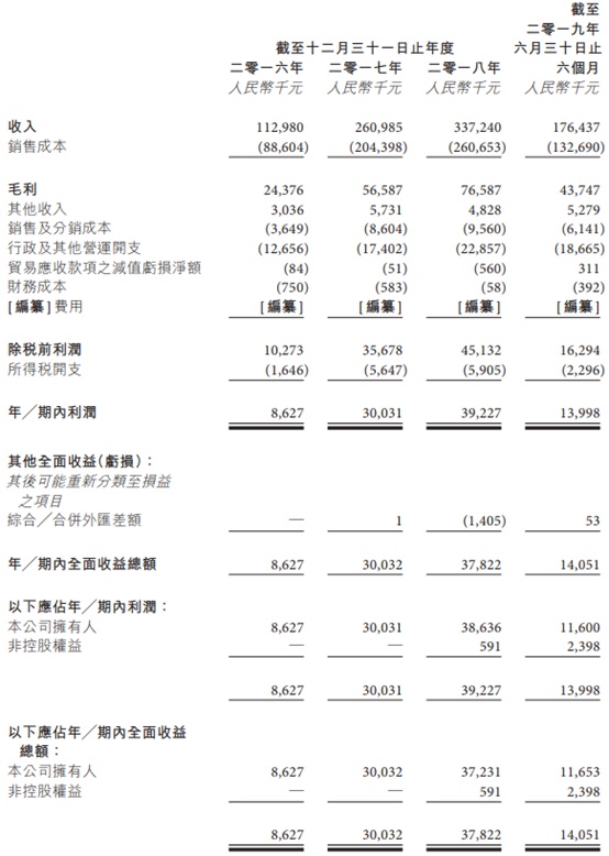 公司的收入呈升势,由截至2016年12月31日止年度约人民币113.0百万元增加约人民币148.0百万元或约131.0%至截至2017年12月31日止年度约人民币261.0百万元,并进一步增加约人民币76.2百万元或约29.2%至截至2018年12月31日止年度约人民币337.2百万元。收入增加主要由于婴儿纸尿裤机器销量增加。收入也由截至2018年6月30日止六个月约人民币140.4百万元增加约人民币36.0百万元或约25.6%至截至2019年6月30日止六个月约人民币176.4百万元。于截至2019年6月30日止六个月的收入增加主要由于已出售的成人纸尿裤机器数目增加,其中截至2018年6月30日止六个月的1台增加至截至2019年6月30日止六个月的8台,较截至2018年6月30日止六个贡献收入增加约人民币57.1百万元或865.2%。