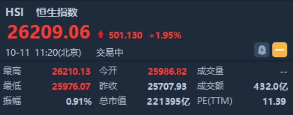智通财经APP获悉,恒生指数今日早盘跳空高开,随后涨幅持续扩大,盘中急升超500点,香港本地股集体反弹,截至11时20分,恒指涨1.95%,报26209.06点,成交额432亿。
