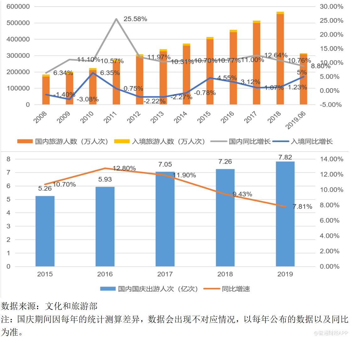 今年的国庆黄金周全国接待游客7.82亿人次,同比增长7.81%,已经连续四年增速放缓,以往年的旅游数据看,国内旅游人数增速也有放缓的迹象,上半年增速仅8.8%,结束了长达十年的双位数增长。