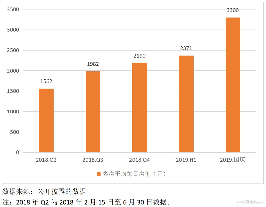 由于开业时间较短,亚特兰蒂斯的入住率仍处于爬坡阶段,从过往季度看,一直处于上升趋势,上半年的入住率为62%,较2018年Q2提升了14.5个百分点,且入住房价也一直处于上升趋势,上半年为2371元,较2018年Q2提升51.8%。国庆属于特殊期间,但入住房价及入住率均远高于行业水平。