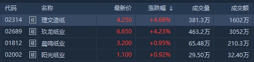 截至发稿,玖龙纸业涨4.86%,报6.69港元;理文造纸(02314)涨4.43%,报4.24港元;晨鸣纸业(01812)涨1.26%,报3.21港元;阳光纸业(02002)涨0.92%,报1.1港元。