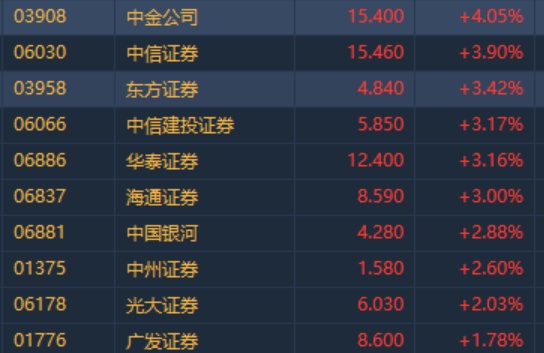 智通财经APP获悉,券商板块午后随A股集体攀升,中金公司(03908)暂领涨中资券商股,截至13时50分,中金公司涨4.05%,报价15.4港元,中信证券(06030)涨3.9%,中信建投(06066)涨3.17%,海通证券(06837)涨3%。