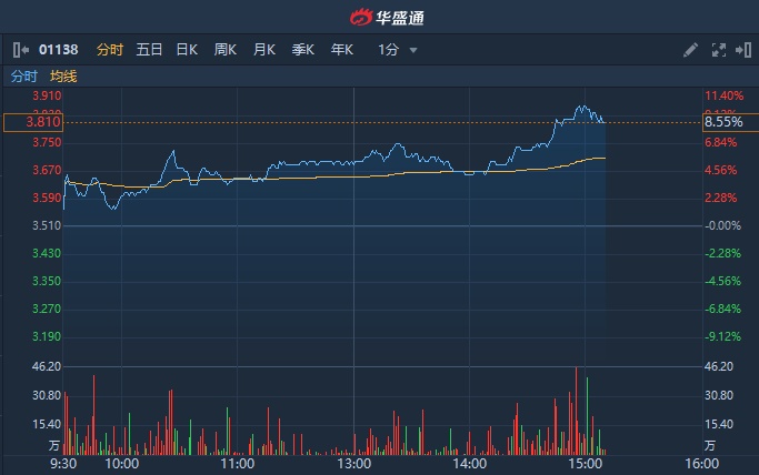 智通财经APP获悉,中远海能A股涨停,H股尾盘涨幅扩大,一度涨近10%。截至发稿,中远海能(01138)涨8.83%,报3.82港元,成交额6544.26万港元。