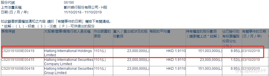 智通财经APP获悉,联交所最新资料显示,10月3日,海通国际增持郑州银行(06196)2300万股,每股作价1.911港元,总金额为4395.3万港元。增持后持股数目约为1.51亿股,持股比例为9.95%。