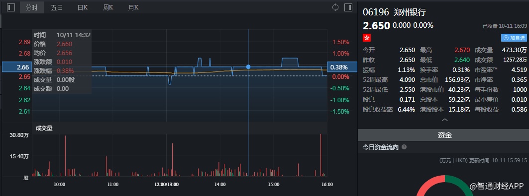 截至今日收盘,郑州银行(06196)无涨跌,报2.65港元。