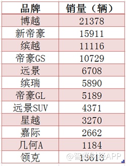 帝豪GS 9月销量10729辆,环比增长51%。轿车领域,全新帝豪9月销量15911辆,持续保持中国品牌轿车销冠。