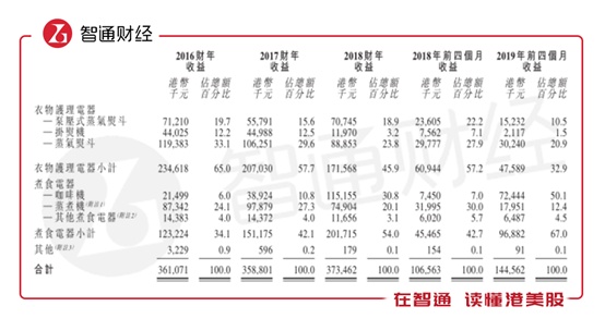 但是分产品看的话,衣物护理电器中的泵压式蒸汽熨斗产品2016年-2018年7121万元、5579万元、7075万元营收起伏较大,2019年前四月更是同比大幅下滑35.47%至1523万元。挂熨机2018年营收也是仅剩1197万元,相比2017你那的4499万元下滑近73.39%,2019年前四月进一步下滑72%至212万元。蒸汽熨斗2016年-2018年1.19亿元、1.06亿元、8885万元的营收,同样呈现逐年下滑的趋势。