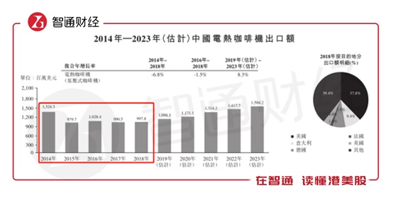 近些年的咖啡机市场大环境形势并不乐观。智通财经APP了解到,由于2014至2015年全球需求疲软及经济的不确定性,导致中国电热泵压式咖啡机出口额出口额,从2014年的13.24亿美元大幅下降至2015年的9.8亿美元,2014年至2018年的复合年增长率为负6.8%。此外,欧洲咖啡机零售额及进口额也于2014年至2015年出现下降,按年增长率分别为负3.7%及负21.4%。目前全球经济仍处在下滑阶段,后续咖啡机市场环境是否能转好,还存在一定不确定性。