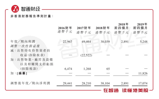 在营收方面,公司2016年-2018年及2019年前四月分别录得3.61亿港元(单位下同)、3.59亿元、3.73亿元以及1.45亿元,在2017年营收出现小幅下滑后,公司2018年及2019年前四月营分别录得4.1%、35.66%的同比增长。