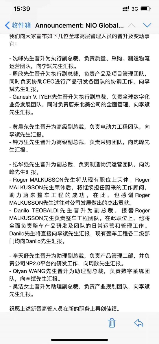 10月11日,一份蔚来全球高层管理人员晋升及变动事宜信件在网络流传,信中提及沈峰、周欣、Ganesh V.IYER晋升为执行副总裁,向蔚来汽车创始人、董事长、CEO李斌直接汇报。