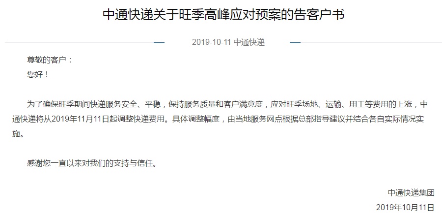 智通财经APP获悉,为确保旺季期间快递服务安全、平稳,保持服务质量和客户满意度,应对旺季场地、运输、用工等费用的上涨,中通快递(ZTO.US)将从2019年11月11日起调整快递费用。具体调整幅度,由当地服务网点根据总部指导建议并结合各自实际情况实施。