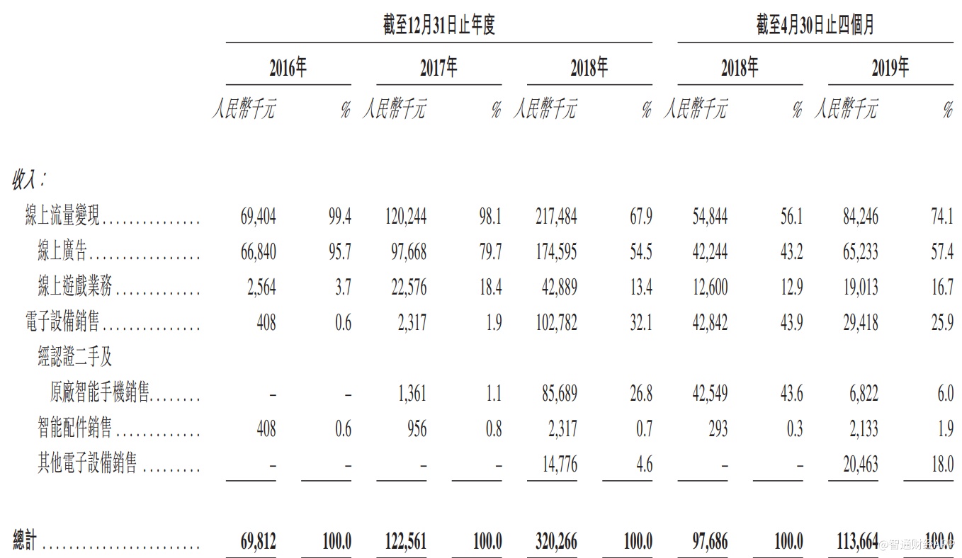 实际上并没那么简单,鲁大师目前的核心业务为线上流量变现,以传统的线上广告为主,线上游戏虽然增长还不错,但2017年以后收入占比具波动性。该公司于2017年引入的二手及原厂智能手机,2018年有一个质的飞跃,不过2019年首四个月收入迅速下降,硬件业务业绩很不稳定。