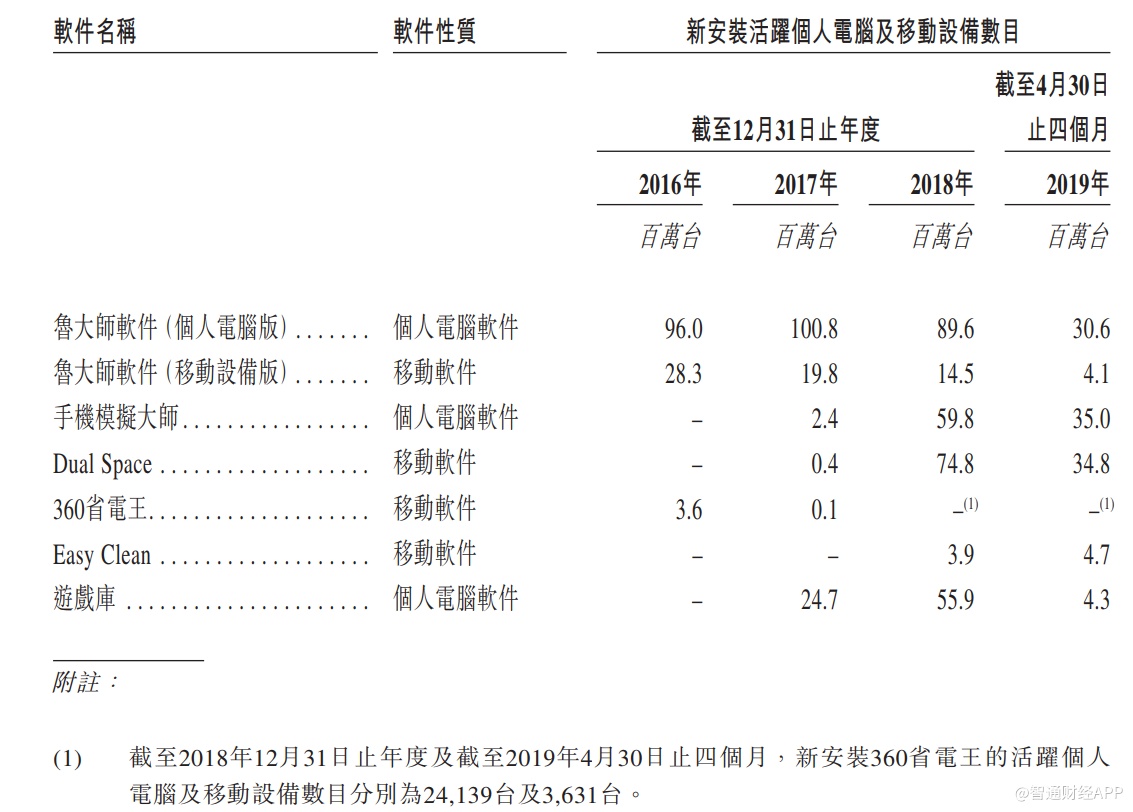 具体而言,首先看核心的流量变现业务。该公司通过开发的7个软件获取流量,分别为鲁大师个人电脑版(2007)、360省电王(2012)、鲁大师移动版(2013)、手机模拟大师(2017)、Dual Space(2017)、游戏库(2017)以及Easy Clean(2018)。