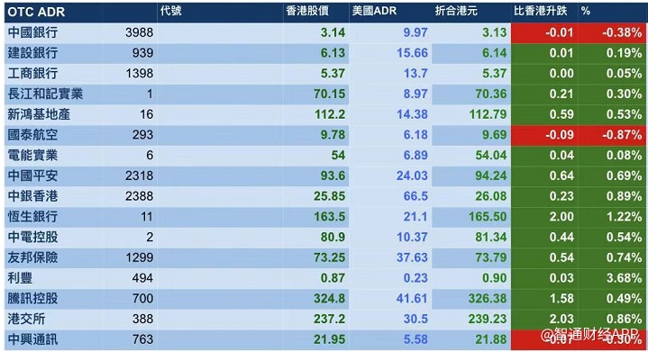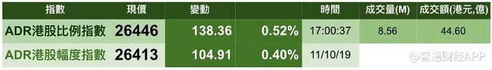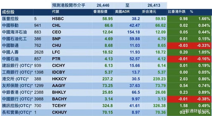 智通财经APP获悉,周五(10月11日)美股强势上扬,三大股指均收涨超1%。港股ADR指数全日向好,按比例计算,收报26446点,涨138.36点或0.52%。汇丰控股收报59.93元,较港收市涨0.98元;腾讯控股收报326.38元,较港收市涨1.58元。