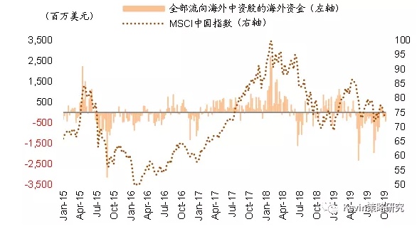 海外资金:本周(10月3日-10月9日)共计4.2亿美元的海外资金流出海外中资股市场(包括H股和美国中概股,vs. 上周流出1.6亿美元),为连续第3周流出,其中有55%来自于专注投资新兴市场的海外基金。