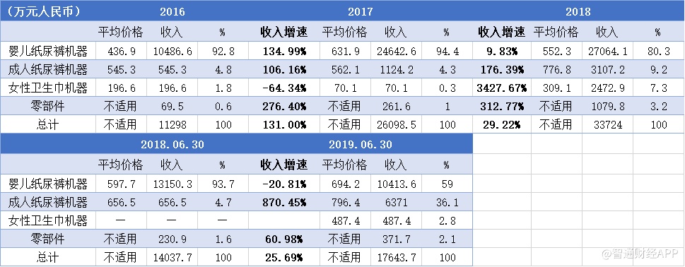 然而,截至2019年6月30日止6个月,公司来自婴儿纸尿裤机器的收入有所下滑,收入占比也随之大幅下滑至59%。相比之下,成人纸尿裤机器则异军突起,收入占比大幅升至36.1%。