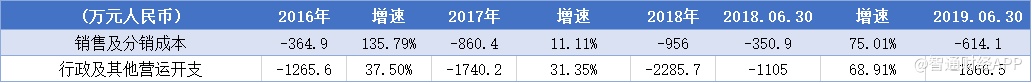 其中,差旅及招待开支、折旧及推广开支为影响公司销售及分销成本的主要因素。截至2019年6月30日止6个月,差旅及招待开支同比增速达95.44%,为公司销售及分销成本最主要费用。研发开支则为行政开支中最主要费用,于2019年中同比增长83.20%。
