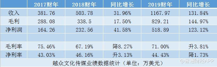 影视制作、电影院经营作为新业务,目前占比仍较小。不过,得益于多渠道广告业务的强劲增长,越众传媒近三年的业绩表现亮眼。从2017财年至2019财年,该公司的收入从381.76万美元增至1167.97万美元,同比增长131.8%。与此同时,公司同期的毛利年复合增长率为144.97%,净利润的年复合增长率为123.12%。