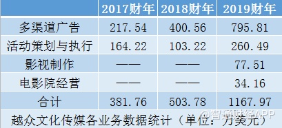 与此同时,越众文化在2019年2月2日、6月16日、9月17日分别在沈阳开始了3个电影院,合计屏幕17个。2019财年时,电影院运营录得收入为34.16万美元,占公司总收入的3%不到。