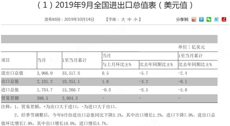 经季节调整后,今年9月份进出口总值同比下降3.1%,其中出口增长1.2%,进口下降7.9%。进出口总值环比增长7.9%,其中出口增长10.6%,进口增长4.7%。