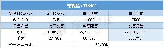 智通财经APP获悉,10月14日,德视佳(01846)配售结束。配售招股价为6.2-8.8港元,最终定价7.5港元,每手7500港元。